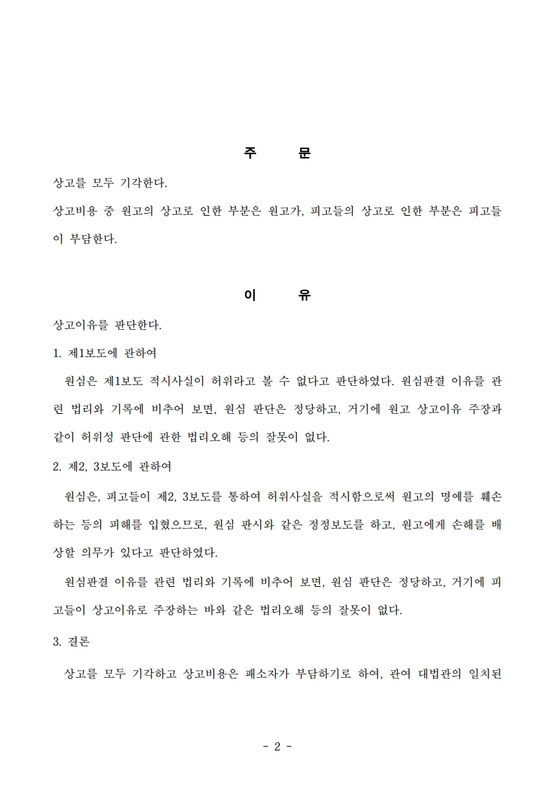 원심은, 피고들이 제2, 3보도를 통하여 허위사실을 적시함으로써 원고의 명예를 훼손