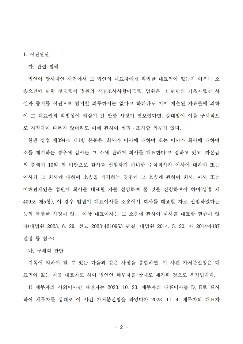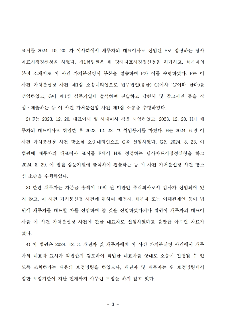 표시를 2024. 10. 20. 자 이사회에서 채무자의 대표이사로 선임된 F로 정정하는 당사